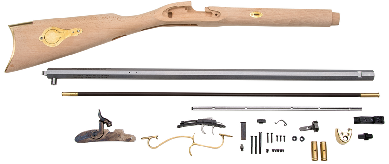 This is a 50 caliber percussion muzzleloader rifle kit featuring a 28" octagonal blued barrel with 1:48" twist and adjustable sights. The kit comes pre-assembled at the factory with select hardwood furniture and brass double set triggers, requiring final assembly by the builder. Weighs approximately 7 lbs and is ideal for hunting and target shooting.