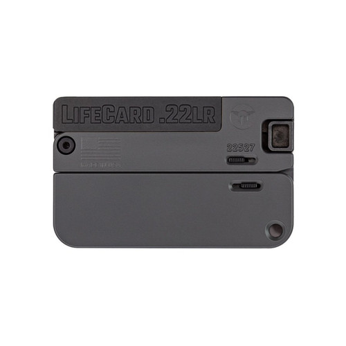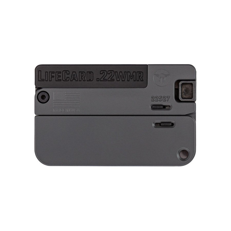 The Trailblazer Lifecard is a single-shot, break-action specialty handgun chambered in 22 Magnum with a 2.5" barrel and aluminum frame. Weighing just 7 oz with an overall length of 3.375", this credit card-sized pistol features concrete aluminum grips and includes storage for 3 additional rounds. Designed as an ultra-compact backup or survival firearm.