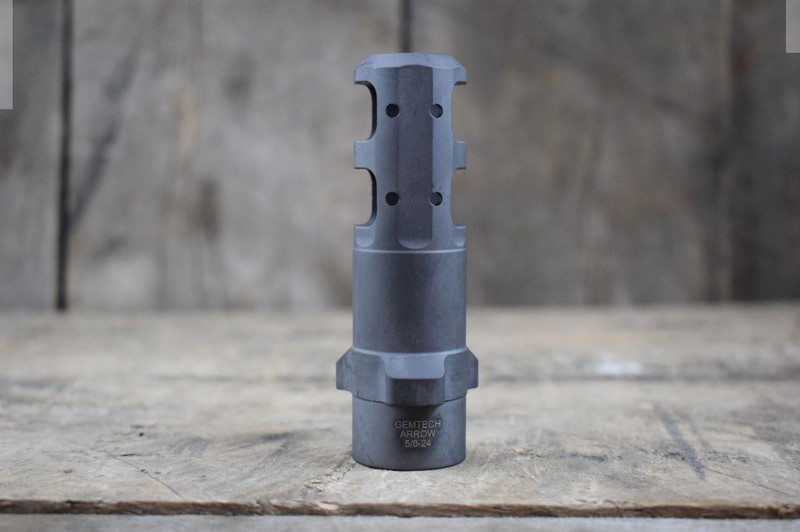 This is a muzzle brake designed for .338 Lapua Magnum rifles with a 5/8x24 thread pitch. It features Gemtech's Tri-Lock quick-mount design and is compatible with Arrow QM suppressors for convenient attachment and removal.