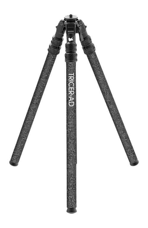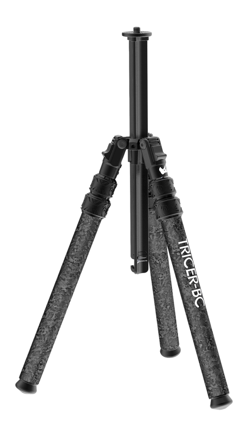 This carbon fiber tripod from Tricer is designed for both standing and sitting shooting positions, providing stability for optics mounting. The lightweight carbon fiber construction offers durability and portability for field use.