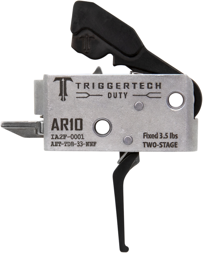 This TriggerTech Duty flat trigger is a two-stage design with a 3.5 lb pull weight, specifically engineered for AR-10 platforms. The trigger features stainless steel construction with an anodized black finish for durability and corrosion resistance. Installation is direct fit for AR-10 receivers without modification.
