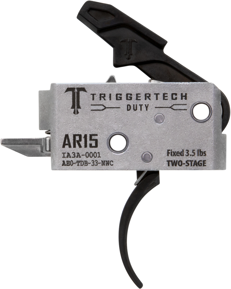 TriggerTech Duty curved trigger designed for AR-15 platforms with a two-stage design and 3.5 lb pull weight. Features patented Zero Creep Technology, stainless steel internals, and an anodized black finish. Installation is direct fit for AR-15 rifles with enhanced tactile feedback and forceful reset.