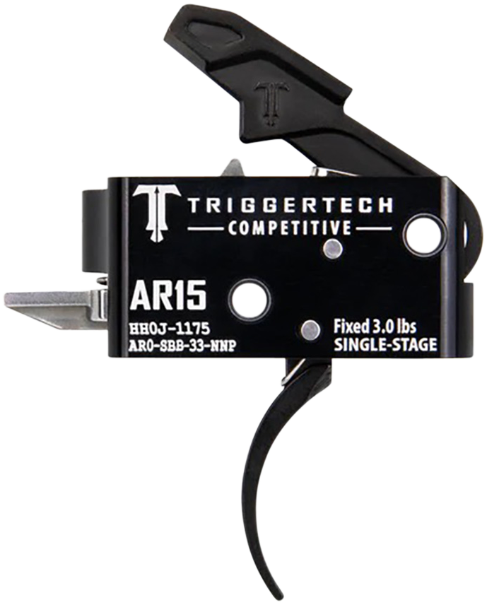 TriggerTech AR-15 compatible single-stage trigger with a curved bow and 3 lb pull weight, designed for competitive shooting. The trigger features a fixed blade design and ships ready to install in standard AR-15 platforms. Precision engineering delivers consistent performance for precision rifle applications.