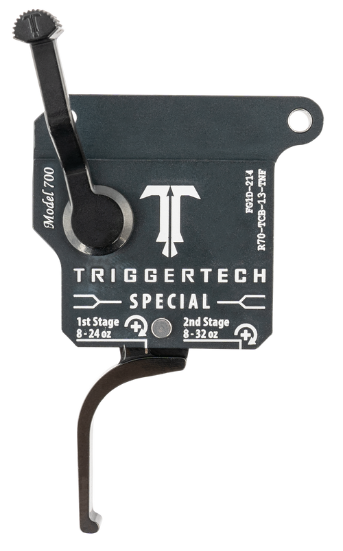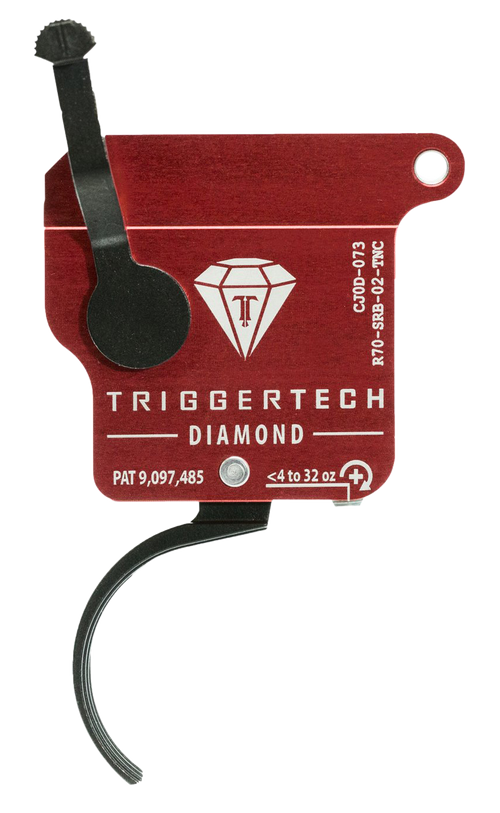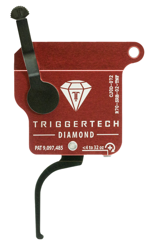 This TriggerTech Diamond two-stage flat trigger is designed for Remington 700 right-hand rifles with a draw weight range of 0.50 to 2.80 lbs. Constructed from 7075-T6 aluminum with a green and black finish, it features TriggerTech's Four Point safety system. The trigger installs directly into Remington 700 receivers without gunsmithing.