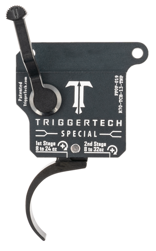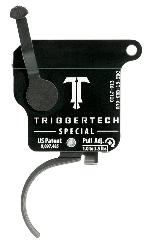 TriggerTech Diamond two-stage pro curved trigger designed for Remington 700 right-handed platforms with pull weights ranging from 0.50-2.80 lbs across stages. Constructed from 7075-T6 aluminum with steel components, featuring TriggerTech's Four Point safety, first-stage lockout, and proprietary TKR and CLKR technologies. Drop-in installation with removable safety and no bolt stop design.