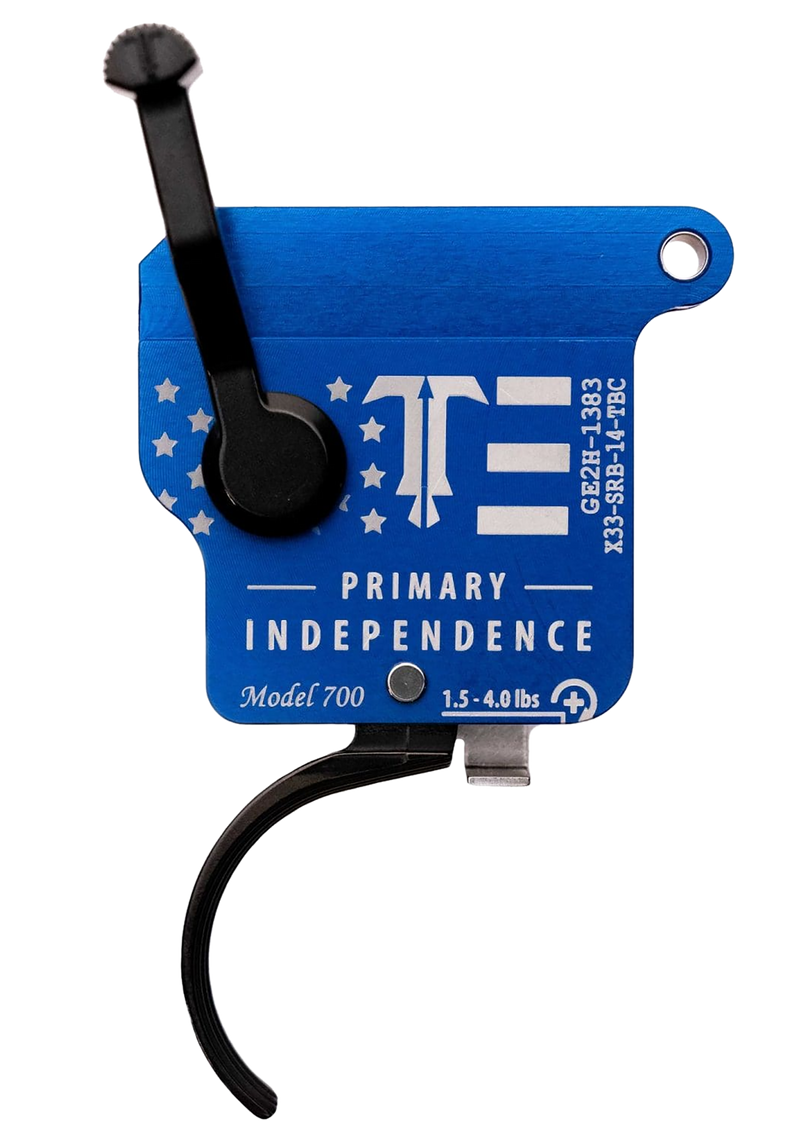 TriggerTech Primary Independence single-stage curved trigger designed for Remington 700 rifles with adjustable draw weight range of 1.50-4 lbs. Manufactured from 7075-T6 aluminum with red and blue finish and white engraving. Drop-in compatible installation for precision shooting applications.