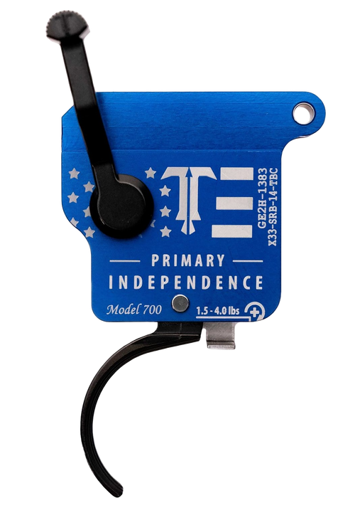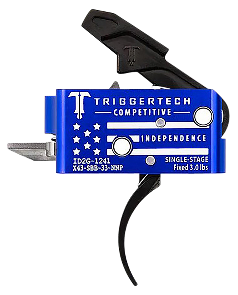 TriggerTech Competitive Independence Pro is a curved two-stage trigger designed for AR-15 platforms, featuring a blue and white engraved flag housing. Constructed from 6061-T6 aluminum with 440C stainless steel components, this trigger delivers precision performance for competitive shooting applications.