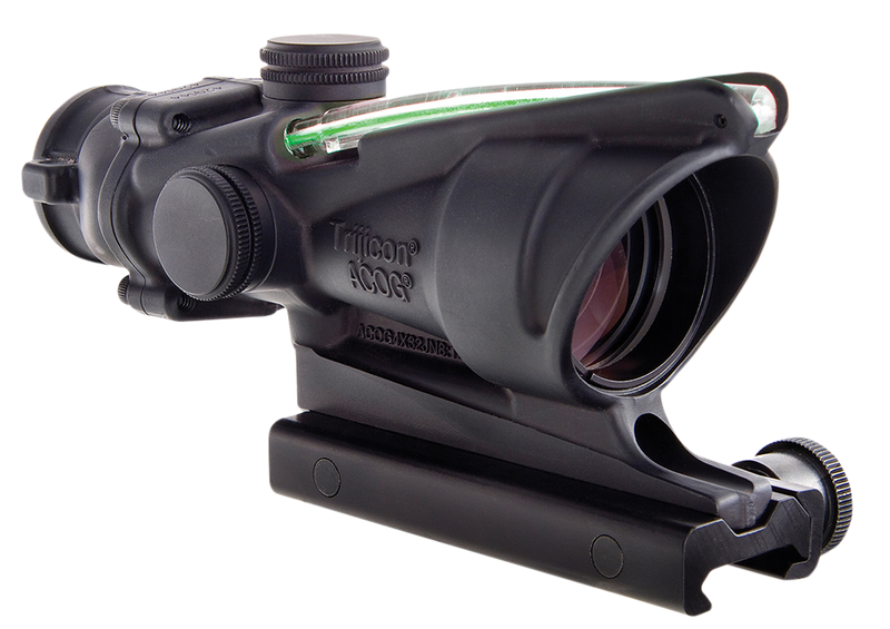 The Trijicon ACOG is a 4x32mm riflescope with dual illumination (fiber optics for daylight, tritium for night) and a green chevron reticle calibrated for .223/5.56 NATO out to 800 meters. The scope includes a TA51 flattop mounting adapter and weighs 9.9 oz without the mount. It is waterproof, fogproof, and shockproof with 1/2 MOA adjustments and 36.8 feet of field of view at 100 yards.