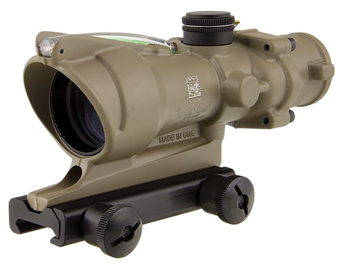 The Trijicon ACOG is a 4x32mm riflescope with an illuminated red horseshoe and red dot reticle calibrated for 6.8 SPC ammunition out to 800 meters. It features dual illumination via fiber optics for daylight and tritium for low-light conditions, weighs 15.10 oz, and is fog, shock, and waterproof. Includes flattop adapter mount and accessories.