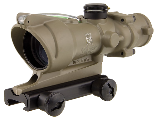 The Trijicon ACOG is a 4x32mm riflescope with dual illumination technology combining fiber optics and self-luminous tritium for consistent aiming point visibility in all lighting conditions. Designed specifically for M4/M4A1 carbines (14.5" barrel), it features a red chevron reticle optimized for 5.56 NATO/.223 Rem and includes a TA51 mount. The scope is waterproof, fogproof, and shockproof with multi-coated optics and weighs 15.8 oz.