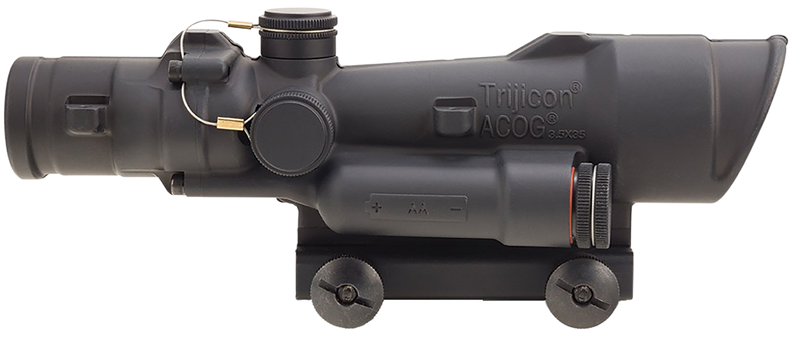The Trijicon ACOG is a 3.5x magnification riflescope with a 35mm objective lens and 30mm-35mm tube diameter, designed for .223/5.56 NATO applications. Features an illuminated green LED crosshair with .223/5.56 BDC reticle for enhanced accuracy. Multi-coated optics with fog, shock, and waterproof construction; weighs 16.80 oz with 2.40" eye relief.