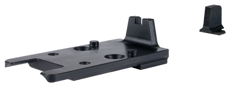 This integrated night sight set from Trijicon is designed specifically for FN 509 pistols and features a steel construction with matte black finish. The set includes a front sight blade, rear mount plate, mounting screws, and wrench, with professional installation recommended. The front blade measures 0.462 inches in height with a 0.140 inch width, and the rear notch features a square profile.