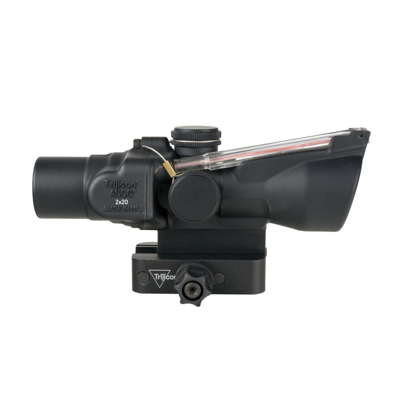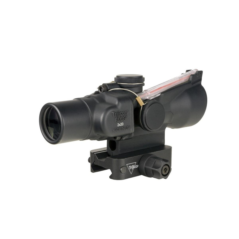 The Trijicon ACOG 2x20 is a compact, fixed 2-power riflescope with 20mm objective and illuminated reticle, designed for firearms with limited mounting space such as 9mm PCC submachine guns. Features a multi-coated lens for enhanced light transmission, shock and waterproof construction, and includes a Mil-Spec aluminum mount with tool-less Q-LOC mounting system. Weighs 8.5 oz with 29.34 ft field of view at 100 yards.