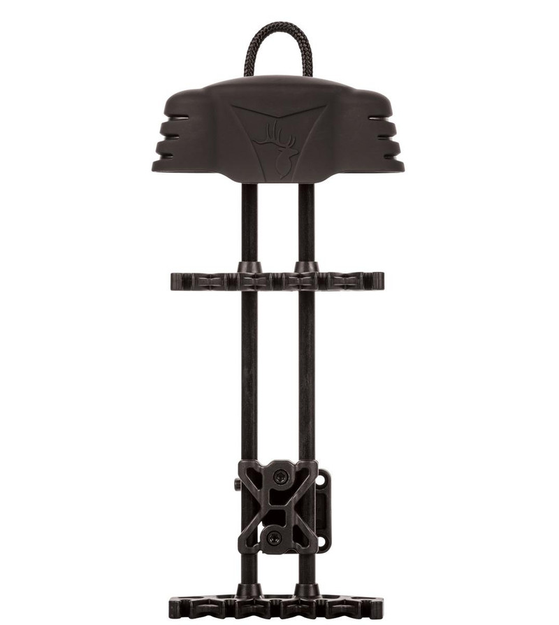 The Trophy Ridge 5-Spot quiver features adjustable dual arrow grippers and a soft-touch hollow hood that eliminates noise while protecting broadheads from dulling. It includes a quick-detach mounting bracket for easy on/off removal and can be left on the bow or hung in a tree. Made from aluminum and polymer construction with a matte black finish and backed by a manufacturer limited lifetime warranty.
