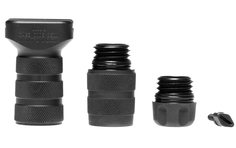 The Troy Modular Combat Grip is a three-part aluminum grip designed for Picatinny rail systems with a waterproof high-capacity storage compartment. It converts between two sizes: 4 5/8" when fully assembled and 3 1/4" in short mode, offering versatile ergonomics and durability for AR-pattern rifles.