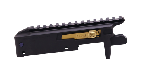 This is a .22 LR receiver set manufactured from aluminum in flat dark earth (FDE) finish. Compatible with .22 conversion platforms, the receiver set serves as the foundation for building or converting a .22 LR firearm and measures 9.7" in length with a 4.3" width and height. Installation requires standard gunsmithing assembly methods.