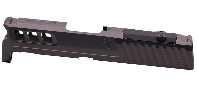 True Precision Axiom optic-cut slide designed for Springfield Hellcat platforms, machined from 416R stainless steel with black DLC anodized finish. This slide is pre-cut for mounting optics and maintains the compact dimensions of the Hellcat platform (6.4" length, 1.8" width and height). A high-quality replacement slide for custom builds or upgrades.