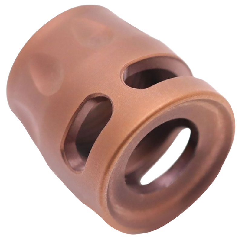 The True Precision Micro Compensator is a compact muzzle brake designed for 9mm and .380 ACP firearms with 1/2"x28 threads. Constructed from 416R stainless steel with a copper PVD finish, it measures 4.6" in length and 0.8" in height, providing effective recoil and muzzle rise reduction in a minimal footprint.