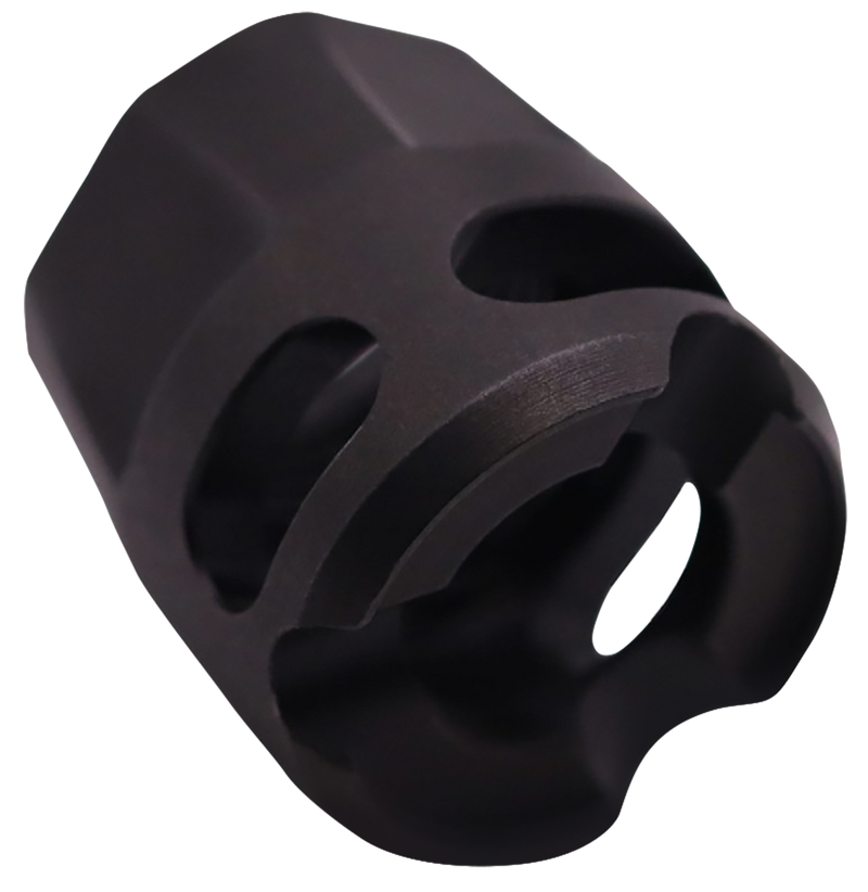 This is a Y-type micro compensator designed for 9mm and .380 ACP firearms with 1/2"x28 threaded muzzles. Constructed from 416R stainless steel with black nitride finish, it measures 4.6" in length and 0.8" in height, providing recoil reduction in a compact profile.