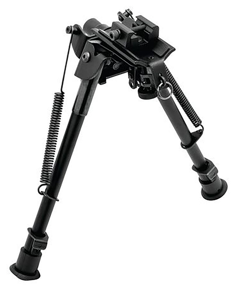 Adjustable bipod with pivoting base for precision leveling on uneven terrain, compatible with sling swivel studs or Picatinny rails via included adapter. Features spring-assisted design with rubber feet and lockable position, suitable for bench or prone shooting. Adjusts from 9" to 13" in height.