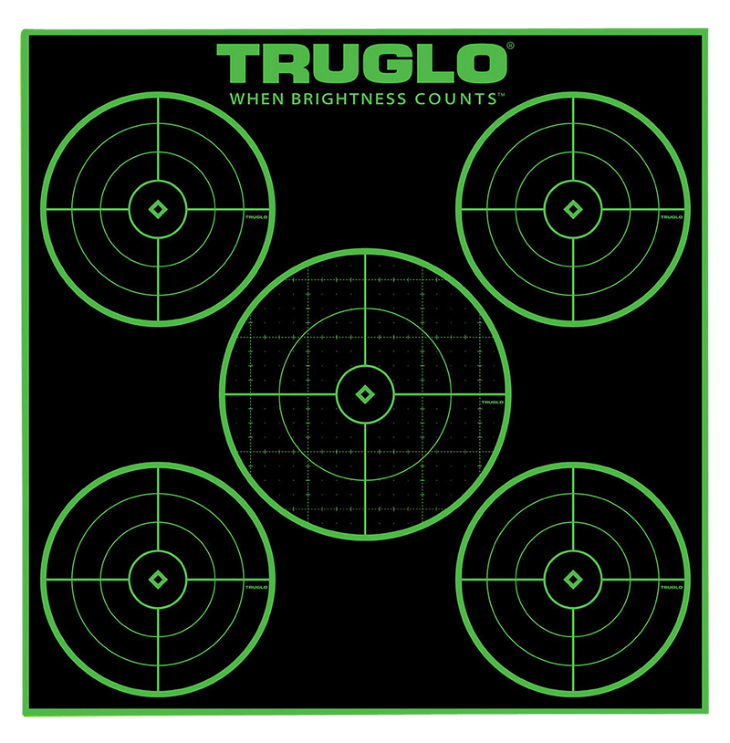 This 25-pack of TruGlo Tru-See targets features five bullseyes per 12"x12" sheet with self-adhesive backing for easy mounting on any surface. Made from heavy paper stock with black and green contrast for visibility at various distances. Includes pasters for economical target reuse.