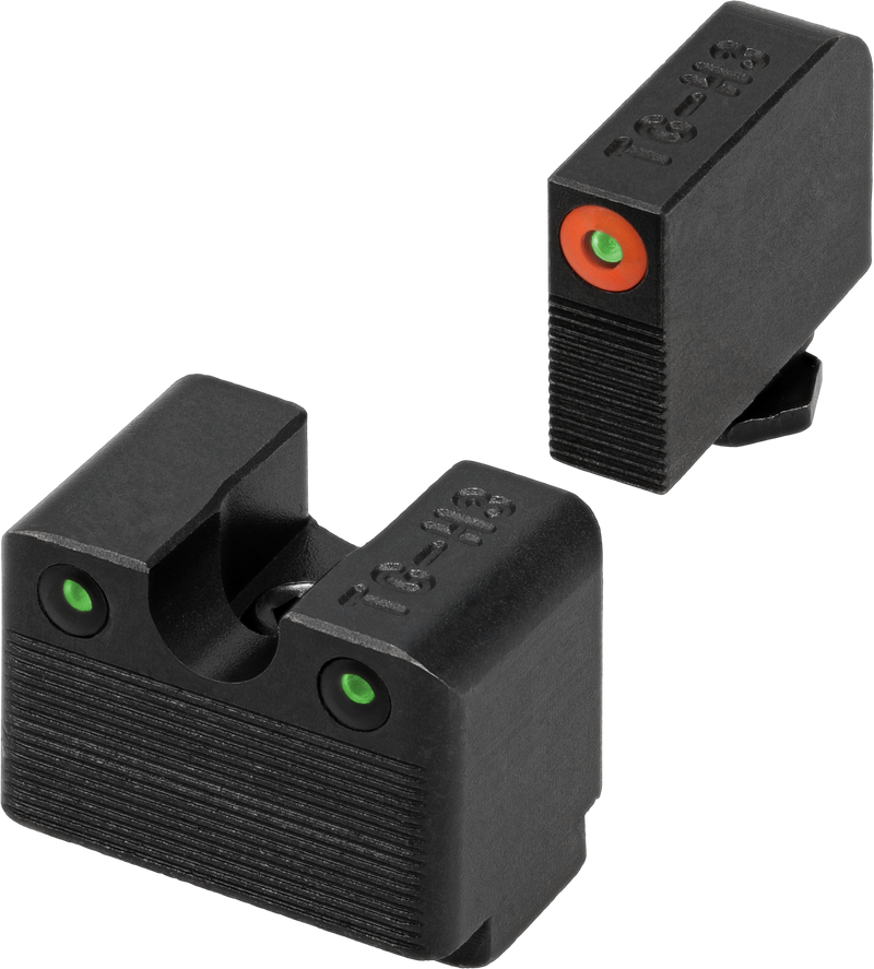 This tritium night sight set for Glock MOS 42/43/43X/48 handguns features green tritium front and rear sights with white outline on the front for enhanced visibility in low-light conditions. Tritium does not require batteries or charging and provides self-illuminating dots for day and night shooting. The sights are machined from steel with a black nitride finish for durability.