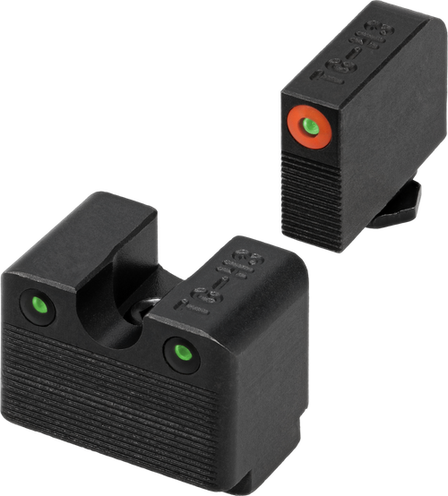 Tritium night sights that glow green in low-light conditions without requiring batteries or charging. Features CNC-machined steel construction with green front and rear tritium elements, compatible with most Glock models in 45 ACP and 10mm calibers. Uses front post and rear dovetail mounting with square front and U-notch rear sight design.