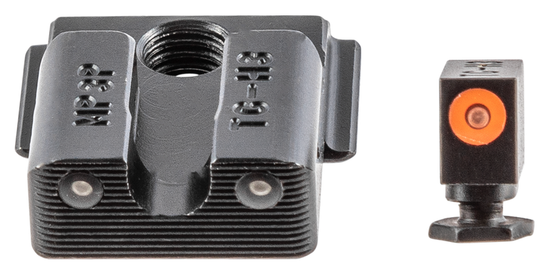 This is a complete tritium night sight set designed for the Smith & Wesson M&P 380 Shield EZ, featuring green tritium vials with an orange focus-lock ring on the front sight for enhanced contrast and faster target acquisition. The rear sight includes an angled edge for emergency one-handed operation. The sights are constructed from CNC machined steel with a black nitride finish and use tritium illumination for low-light visibility.