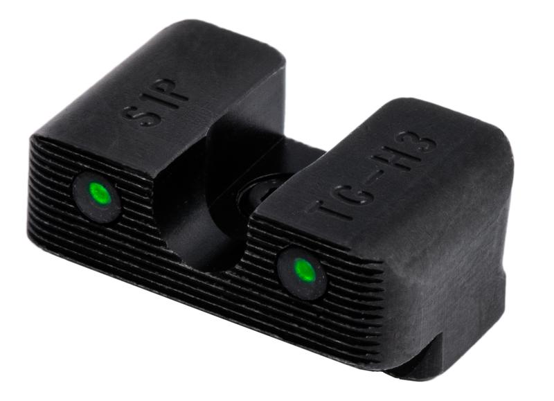 These tritium night sights feature green tritium vials with white outline front sight and green tritium rear sight, designed for Sig Sauer P-Series handguns with #8 front and #8 rear dovetails. The sights include a front sight Focus-Lock ring for faster focus and a U-notch rear design for quick target acquisition in low-light conditions. Built with CNC machined steel in black nitride Fortress finish for durability.