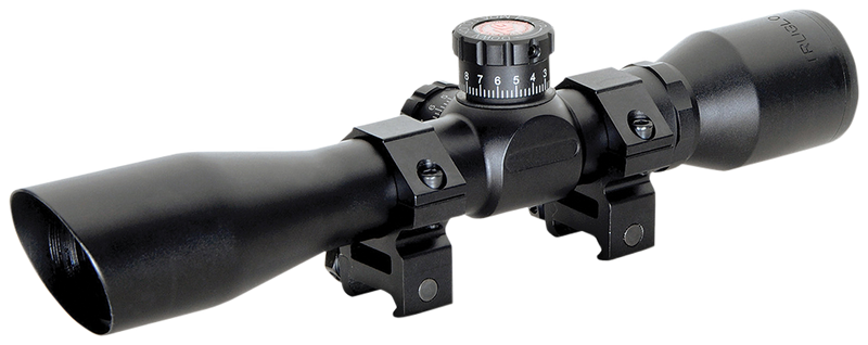 Fixed 4x magnification riflescope with 32mm objective lens and 1" tube diameter. Features mil-dot reticle, fully multicoated optics, and is fog-proof, waterproof, and shock resistant. Includes Weaver-style mounting rings for quick installation and weighs 12.5 oz with 5.5" eye relief.