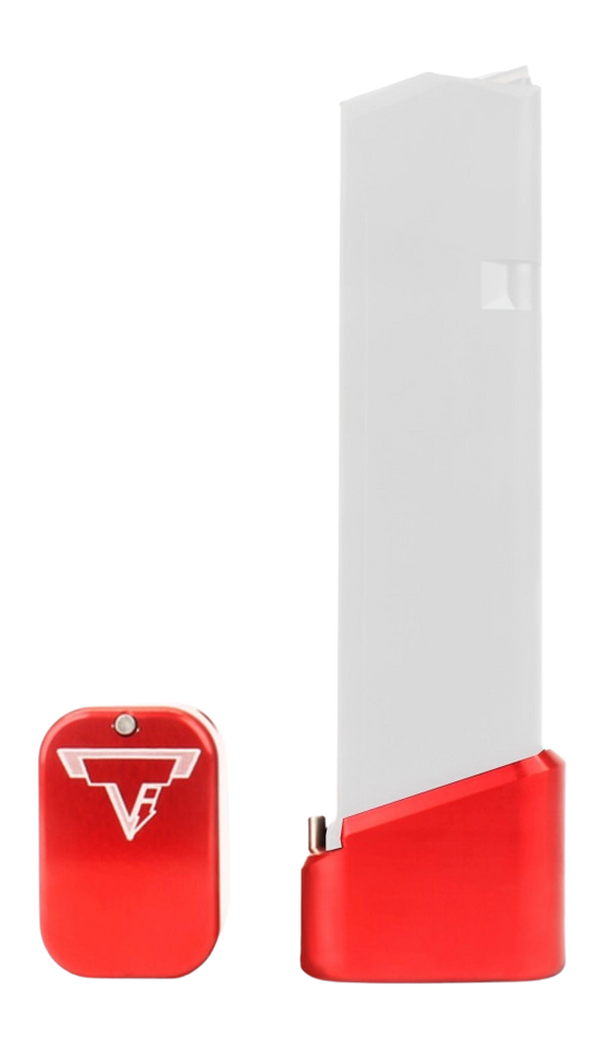 Taran Tactical Firepower base pad extends Glock 9mm and .40 S&W full-size magazines by 5 to 6 rounds. Features a hard coat anodized red finish and includes an extended magazine spring. This accessory increases magazine capacity while maintaining compatibility with standard Glock magazines.