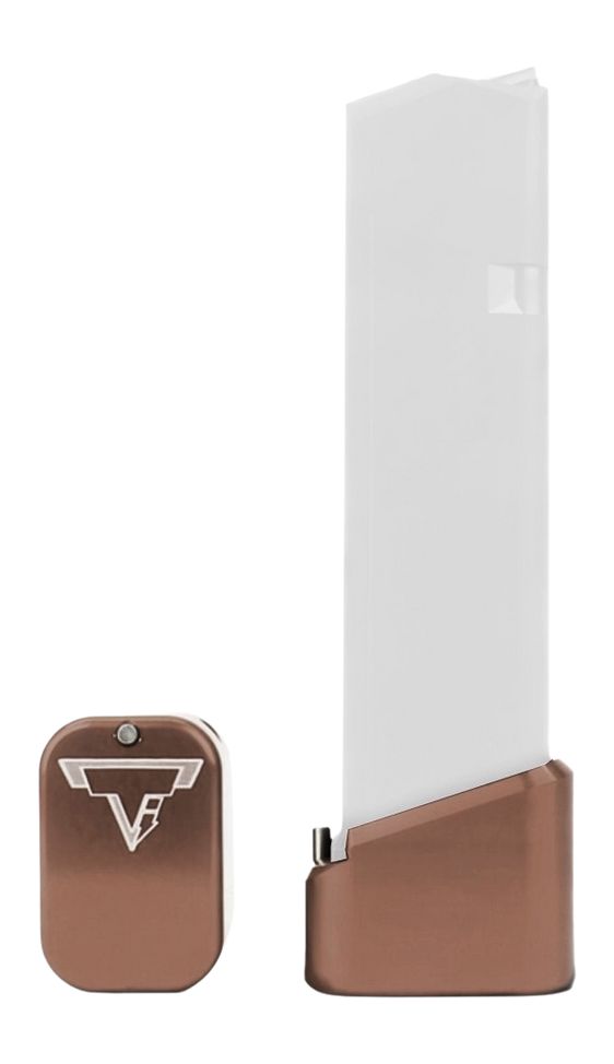 Taran Tactical Firepower base pad kit designed for Glock 9mm and .40 S&W magazines, extending capacity by 5 to 6 rounds. Features a coyote bronze hard coat anodized finish and includes an extended magazine spring. This accessory is subject to state restrictions in certain jurisdictions.