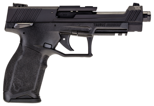 The Taurus TX22 Competition is a striker-fired semi-auto pistol chambered in .22 LR with a 5.25" threaded barrel and 16+1 round capacity. Features include a polymer frame with FDE finish, adjustable white dot sights, barrel-mounted optics mount with two two-sided mounting plates, and Taurus Performance Trigger. Weighs 17.3 oz with an overall length of 8.15".