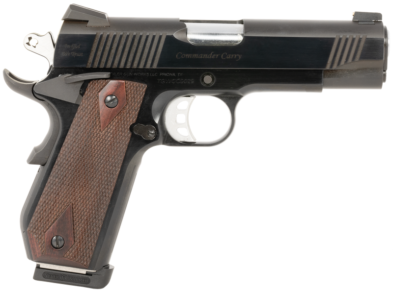 This Tyler Gun Works Custom 1911 Commander is a semi-automatic pistol chambered in 45 ACP with a 4.25" stainless match grade barrel and 7+1 capacity. The blued serrated steel slide and blued steel frame feature a beavertail grip safety, with walnut grips completing the classic 1911 design. Overall dimensions are 16.0" length x 2.5" height x 11.5" width.