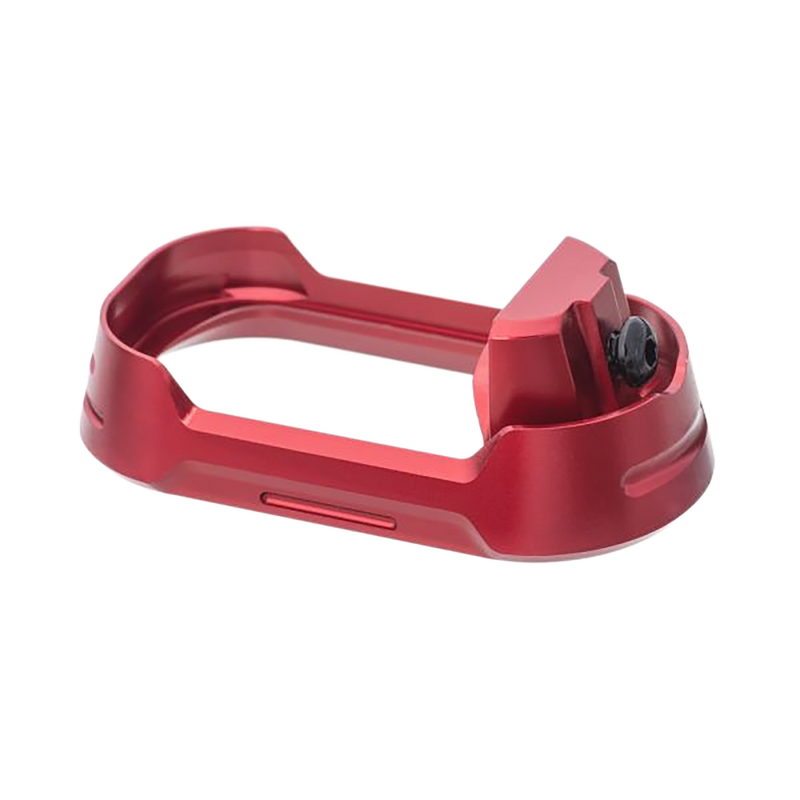 This magwell is designed to fit Glock 19 Gen 3 and Gen 4 pistols, constructed from red anodized aluminum for durability and improved magazine loading. The magwell accessory enhances ergonomics and magazine insertion speed during tactical or competitive shooting.