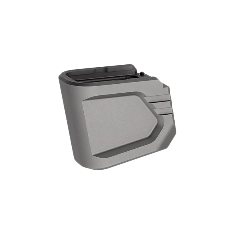 This magazine extension for Glock 43x and 48 handguns is machined from aerospace grade aluminum in gray. It increases magazine capacity and extends the grip for improved control and comfort.
