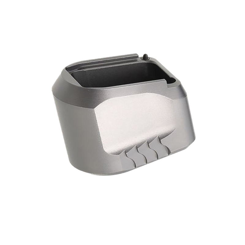 This magazine extension is designed to fit S&W M&P 9mm and .40 S&W 5-round magazines and is compatible with full-size M&P 1.0 and 2.0 frames. Constructed from grey aluminum for durability and corrosion resistance.