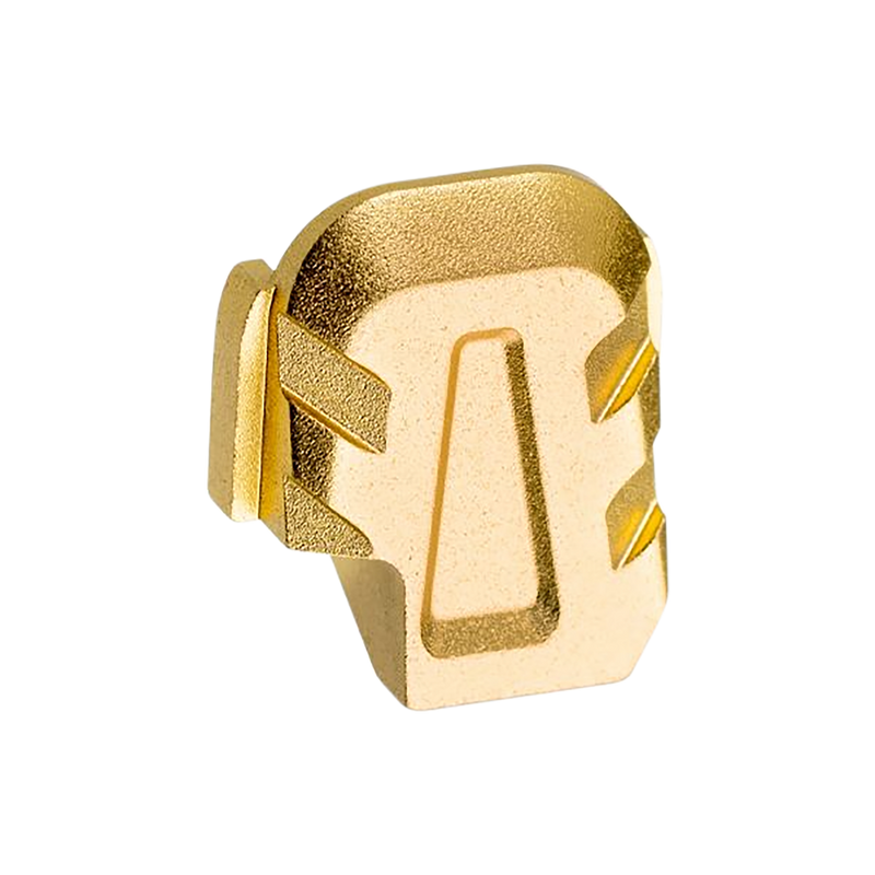 Tyrant CNC rear slide cap designed for the Sig Sauer P365 pistol. Constructed from aerospace grade aluminum with a gold finish for enhanced aesthetics and durability.