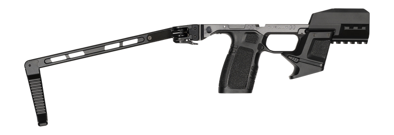 This is a stabilizing brace chassis designed for the Sig P365 FCU and slide, constructed from gunmetal aluminum and polymer materials. The folding design provides compact storage and portability while maintaining a rigid shooting platform. Installation is direct fit to the P365 platform without requiring additional modifications.