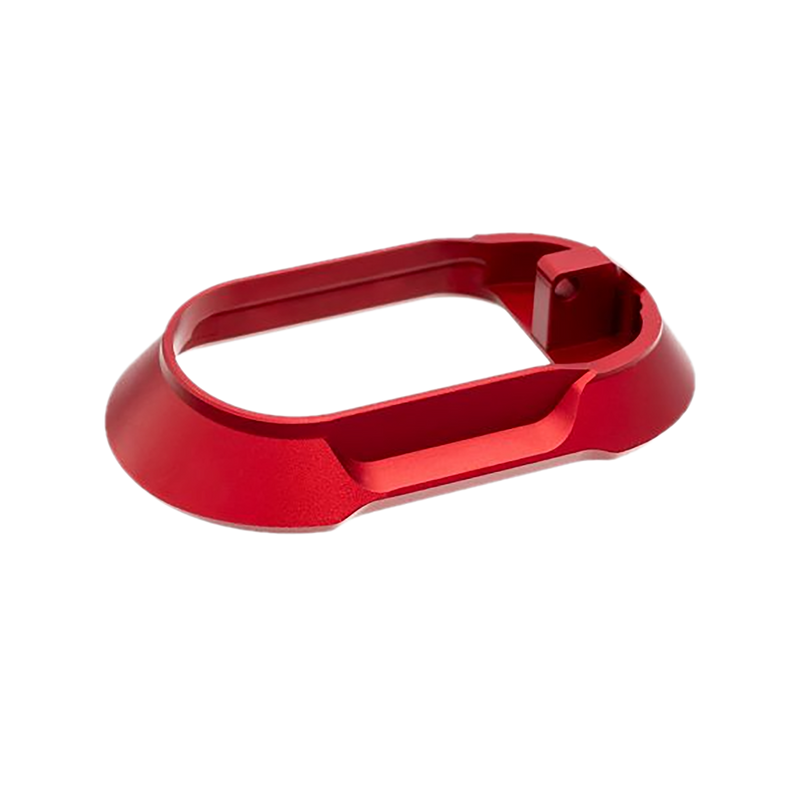 This magwell is designed to fit Heckler & Koch VP9 and VP40 pistols, enhancing magazine insertion speed and ergonomics. Constructed from anodized aluminum in red, it provides a durable and lightweight accessory for competitive shooters and tactical users.