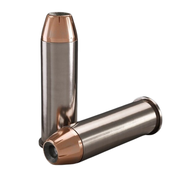 Underwood 44 Rem Mag ammunition featuring 300 grain Jacketed Hollow Point bullets loaded to 1300 fps with 1126 ft-lbs of muzzle energy. Nickel-plated brass casing provides corrosion resistance and reliable feeding. Each box contains 20 rounds, sold 10 boxes per case.