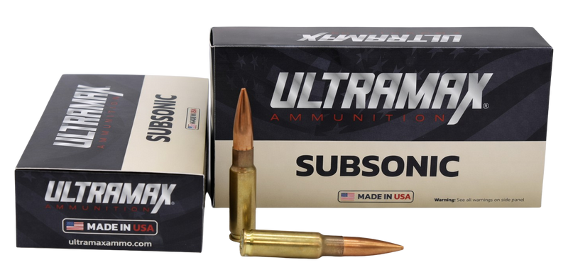 Ultramax 8.6 Blackout ammunition loaded with 300 grain hollow point boat tail (HPBT) projectiles. This round is packaged as 20 rounds per box, 10 boxes per case, and is suitable for modern sporting rifles chambered in 8.6 Blackout.