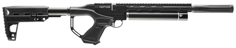 The Umarex Notos is a .22 caliber pre-charged pneumatic (PCP) air rifle with an 11.75" barrel delivering 700 fps and featuring a 7-shot auto-indexing rotary magazine and side lever action. This compact carbine includes an adjustable stock, 3-baffle SilencAir muzzle device for reduced noise, and weighs 4.15 lbs, making it ideal for small game hunting, plinking, and target shooting.