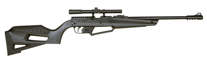 The Umarex NXG APX is a youth-oriented air rifle chambered in .177 caliber with a 20" barrel and spring piston/multi-pump pneumatic action, delivering 800 fps. It features a black synthetic stock, fiber optic front and adjustable rear sights, included 4x15mm scope, automatic safety, and ergonomic narrow grip designed for younger and small-framed shooters.