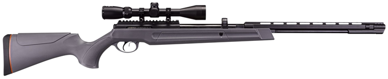 The Umarex Synergis is a .177 caliber underlever air rifle with an 18.6" barrel delivering 1,000 FPS. It features a gas piston operating system, synthetic stock, non-adjustable trigger, and 10-round capacity. This model includes a 3x9x40mm scope and all-weather construction.