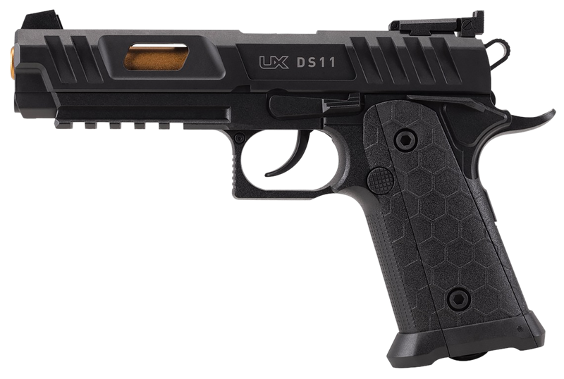 The Umarex DS11 is a .177 caliber BB air pistol featuring a CO2 powered semi-automatic action that launches steel BBs at 400 FPS. It features a double-stack 1911-style design with an aggressively cut slide, dual cutaway windows, under-barrel Picatinny rail, high-set sights, and a black polymer frame with black polymer grips. The stick magazine holds 18 BBs with one additional round in the chamber (18+1 capacity).