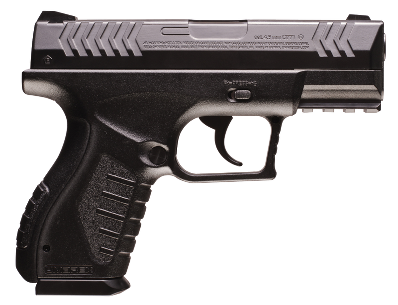 The Umarex XBG is a CO2-powered air pistol chambered in .177 BB with a 4.25" smooth bore steel barrel and double-action trigger. It features a 19-round drop-free metal magazine, fixed front and rear sights, and delivers 410 FPS velocity. This lightweight compact pistol has synthetic grips and is powered by a single 12g CO2 capsule.