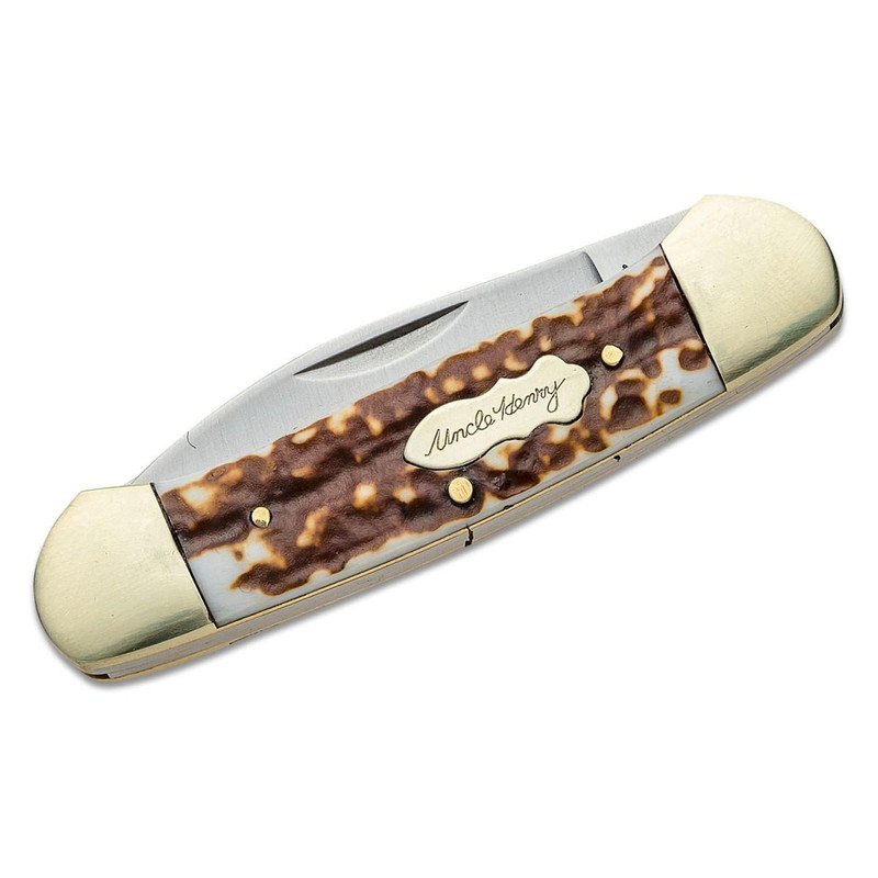 The Uncle Henry Next Gen Large Canoe features a 2.5" drop point blade made from 7Cr17MoV stainless steel with a plain edge. The knife has a brown polymer Staglon handle, slipjoint lock mechanism, and an overall length of 6.1". It weighs 2.8 oz and comes with a manufacturer's limited lifetime warranty.