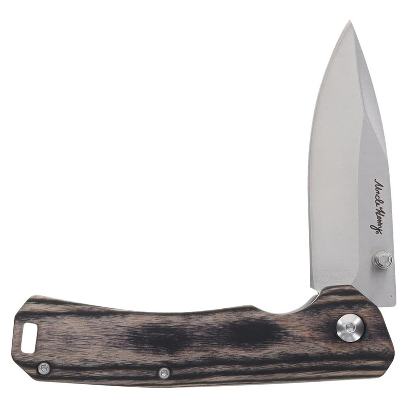 The Uncle Henry folding knife features a 3-inch drop point blade made from high-carbon stainless steel with a satin finish, providing a balance of sharpness, edge retention, and corrosion resistance. The knife has a brown Pakka wood handle with a lock back mechanism and measures 7 inches overall length, making it suitable for everyday carry and outdoor utility tasks such as cutting rope, opening packages, and camping. This knife is compliant with California Prop 65 regulations.