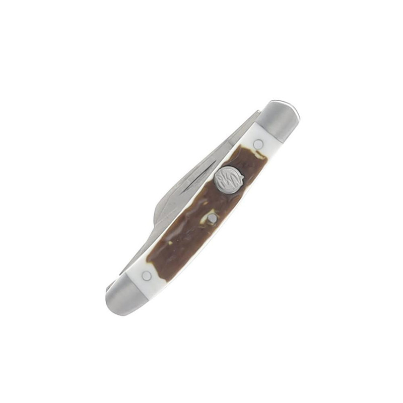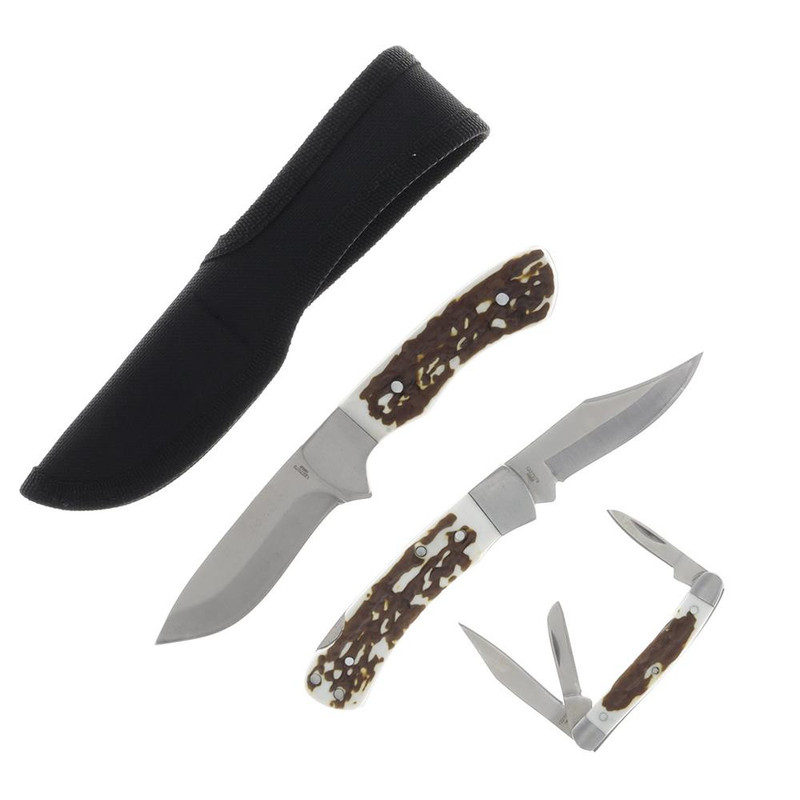 This versatile 3-piece knife combo includes one fixed blade and two folding knives, all featuring stainless steel blades with a satin finish. The knives are equipped with signature Staglon handles, stainless steel bolsters, and inlaid shields, designed for outdoor adventures and everyday cutting tasks. Drop point blade style with plain edge and 3" blade length on the fixed knife.